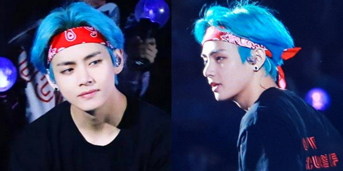 이날 공연에서 멤버 뷔는 강렬한 파란색 머리와 반다나를 조합해 팬들의 시선을 단번에 사로잡았다.