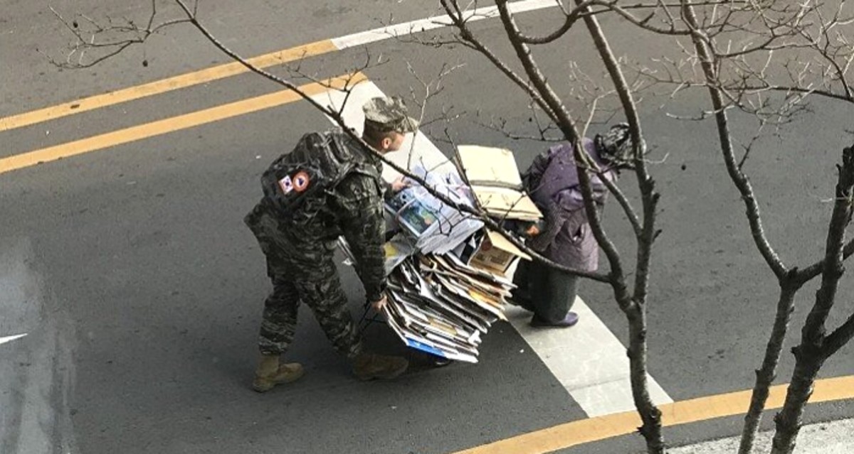 이 해병대원은 할머니가 겨우 모은 폐지가 떨어질까 조심스럽게 두 손으로 붙잡은 뒤, 무겁지 않도록 뒤에서 수레를 살짝 밀어주고 있다.