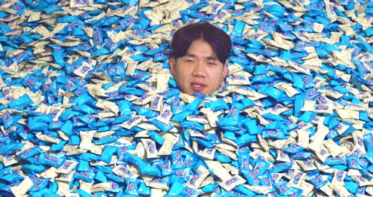 이는 1,300만원어치로, 무려 7,496봉지에 달하는 어마어마한 양이었다. 보겸은 제자리에서 젤리를 뜯기 시작했다.