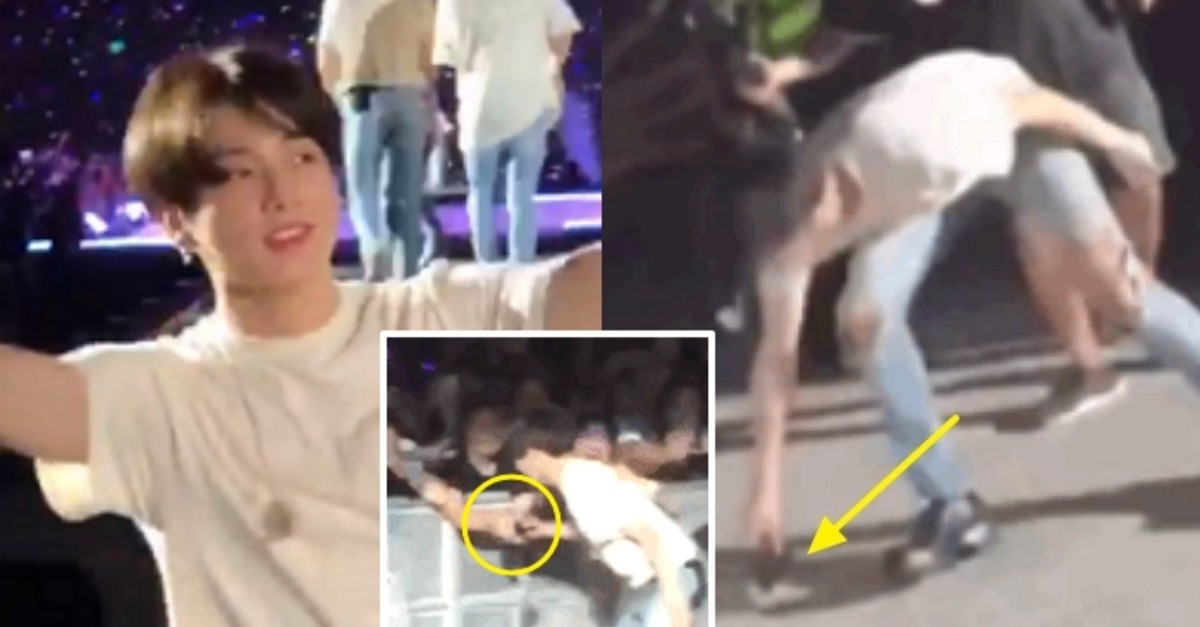 이때 한 팬은 정국의 멋진 자태를 담으려다 휴대폰을 떨어트리게 됐고, 갑작스러운 상황에 당혹감을 감추지 못했다.
