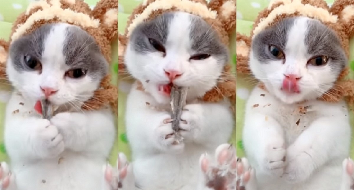 고양이가 씹을 때 마다 울려 퍼지는 "바삭, 바사삭"하는 소리는 보는 이들이 당장 마른 멸치를 찾아 먹고 싶게 만들었다.