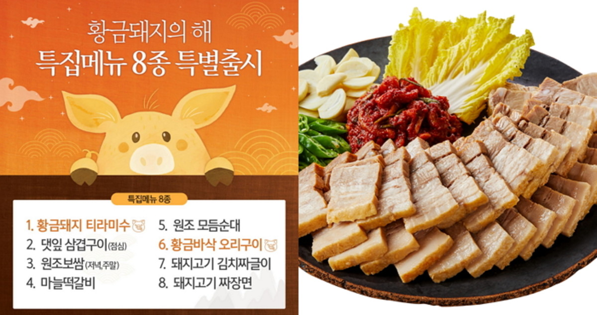신메뉴는 황금돼지 티라미수, 댓잎 삼겹구이, 원조 보쌈, 마늘 떡갈비, 원조 모듬순대, 황금바싹 오리구이, 돼지고기 김치 짜글이, 돼지고기 짜장면 등 8종이다.
