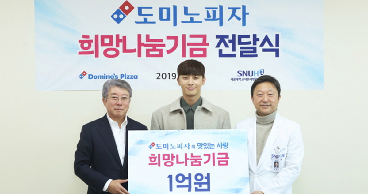 이번 전달식에는 오광현 한국 도미노피자 회장, 조태준 서울대어린이병원 원장, 한국 도미노피자 전속 모델 박서준이 참석했다.