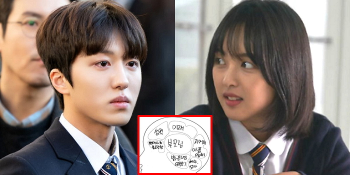 그의 뇌구조 그림에는 '부모님', '과거의 아픔(상처', '밝은 느낌(긍정적)', '혜나, 엄마', '미래', '성적', '현대사회 불공정함'이 담겨있다.