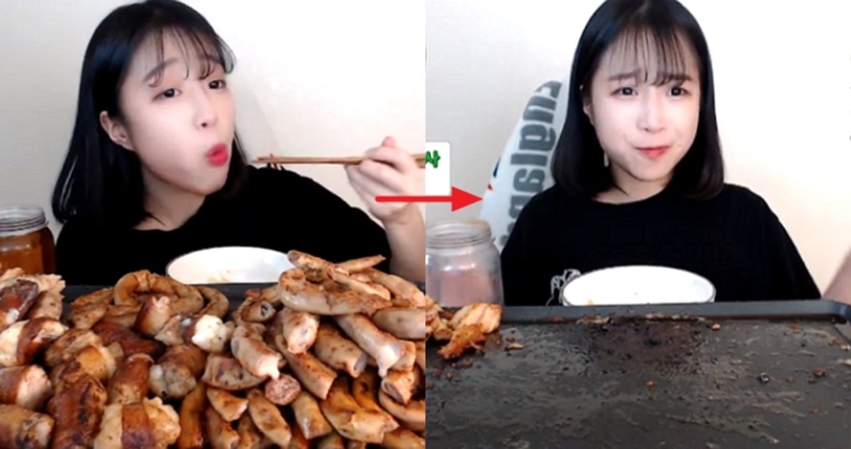 쯔양은 불판 위에서 먹기 딱 좋은 정도로 구워진 곱창을 자르지도 않고 통째로 집어 입에 쏙 넣었다.