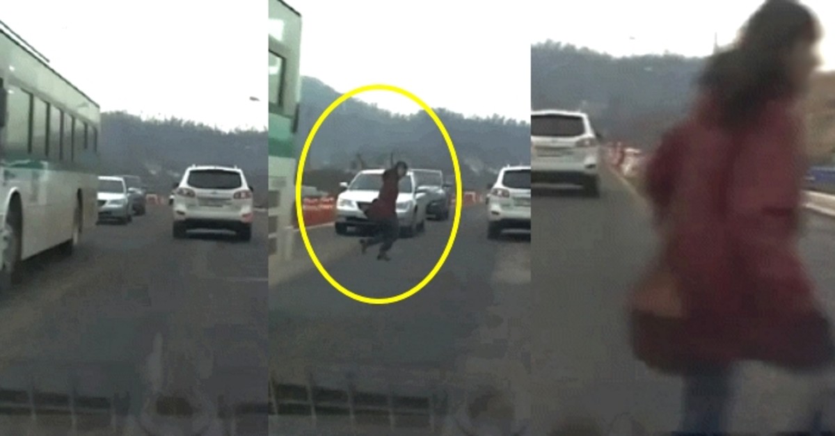 당황한 운전자는 여성을 피하고자 안간힘을 쓰며 핸들을 틀었다. 차량은 왼쪽 반대편 차선 방향으로 휘청거리다가 급정거했다.