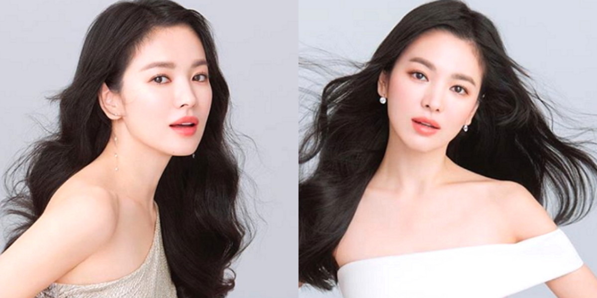 송혜교는 웨이브 머리를 하고 앞머리를 없앤 채 우아한 비주얼을 뽐냈다.