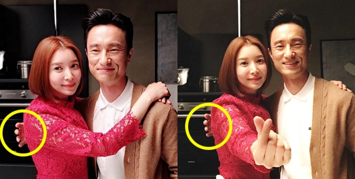서로 딱 붙어 다정하게 찍은 사진에서 김병철은 손이 윤세아 몸에 직접적으로 닿지 않도록 공간을 두고 있다.