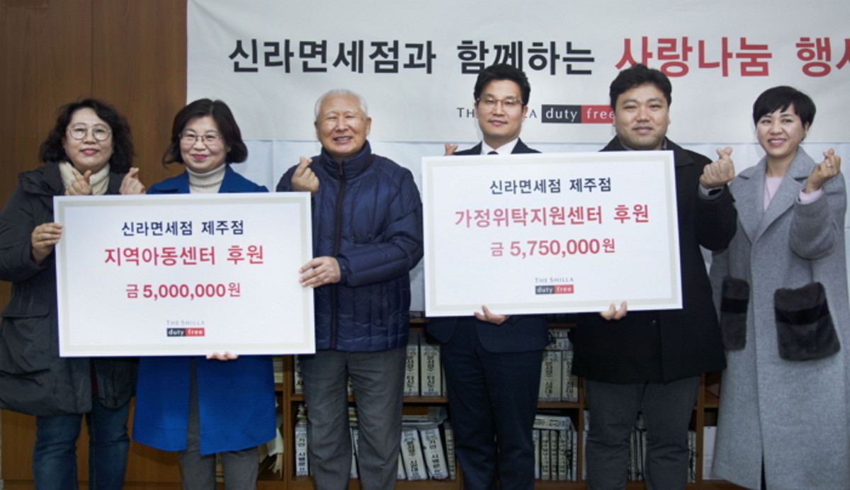 1일 신라면세점에 따르면 신라면세점 제주점은 지난달 31일 제주도자원봉사센터를 방문해 가정위탁지원센터 장학금과 하귀·김녕 지역아동센터 프로그램 지원비를 전달했다. 앞서 30일에는 제주 연동 주민센터에 방문해 저소득층·한부모 가정 대상 제주사랑상품권과 독거 노인 대상으로 된장, 고추장, 소금 등 부식 세트를 기부했다.