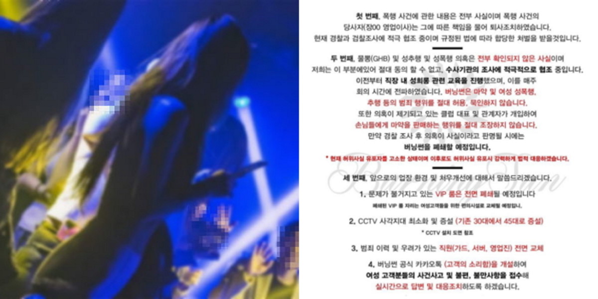 그는 "최근 불거진 안 좋은 일로 인해 저희 클럽을 찾는 모든 여성 고객분들께 심려를 끼쳐서 죄송하며 이번 사건을 계기로 더욱더 여성 고객님들이 안전하고 깨끗한 클럽 문화를 즐길 수 있도록 최선의 노력을 다하겠다"고 말하면서 거듭 사과했다.