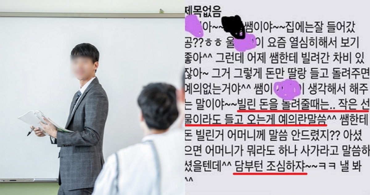 학원 선생님은 딸에게 "돈을 빌려 간 후 갚을 때는 돈만 돌려주면 예의가 없는 것이다"며 "돈을 갚을 때는 작은 선물이라도 들고 오는 게 예의다"고 장문의 문자를 남겼다.
