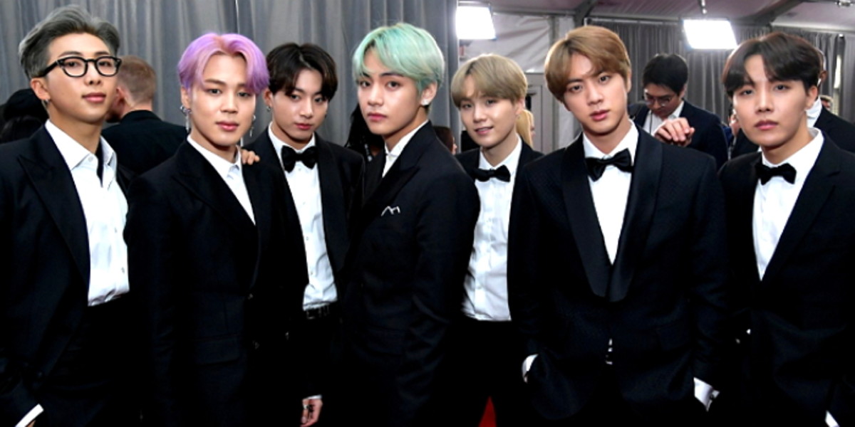 일곱 명 멤버들 모두 단정하게 턱시도를 차려입고 등장했다. 특히 뷔는 민트색, 지민은 보라색으로 헤어 컬러를 변신해 눈길을 확 끌었다.