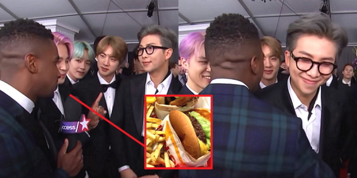 리포터는 인 앤 아웃의 대표 메뉴 '더블더블'과 히든 메뉴 '애니멀 치즈 프라이'를 언급하며 신이 난 듯 RM과 하이파이브를 했다.
