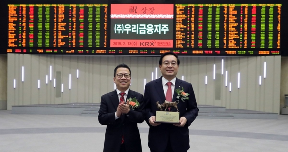 우리금융지주는 한국거래소에서 손태승 우리금융그룹 회장 겸 우리은행장과 정지원 한국거래소 이사장이 참석한 가운데 신규 상장 기념행사를 가졌다.