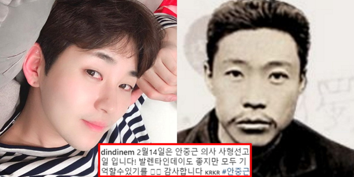 딘딘은 안중근 의사의 사진을 올리며 "2월 14일은 안중근 의사 사형선고 일입니다. 밸런타인데이도 좋지만 모두 기억할 수 있기를. 감사합니다"라는 글을 남겼다.