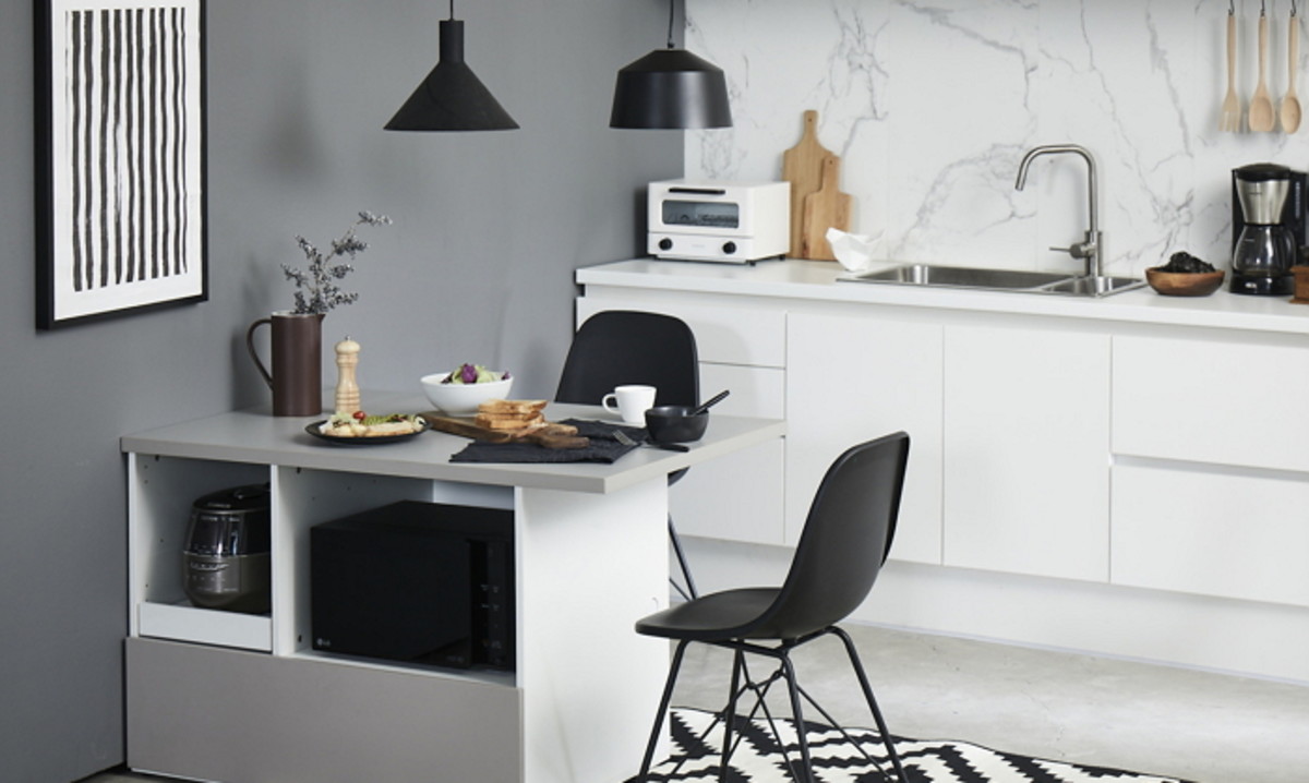 때문에 별도의 의자가 필요 없이 안정적인 자세로 식사가 가능하다. 또 아일랜드 식탁 역시 완전 인출식으로 설계해 10인용 전기 밥솥은 물론 광파 오븐까지 부피가 큰 가전 제품도 넉넉히 수납할 수 있도록 했다. 각종 오염에 강하고, 내구성이 강해 어린 자녀가 식탁에 낙서를 하거나 오염물을 떨어뜨려도 쉽게 제거할 수 있다.