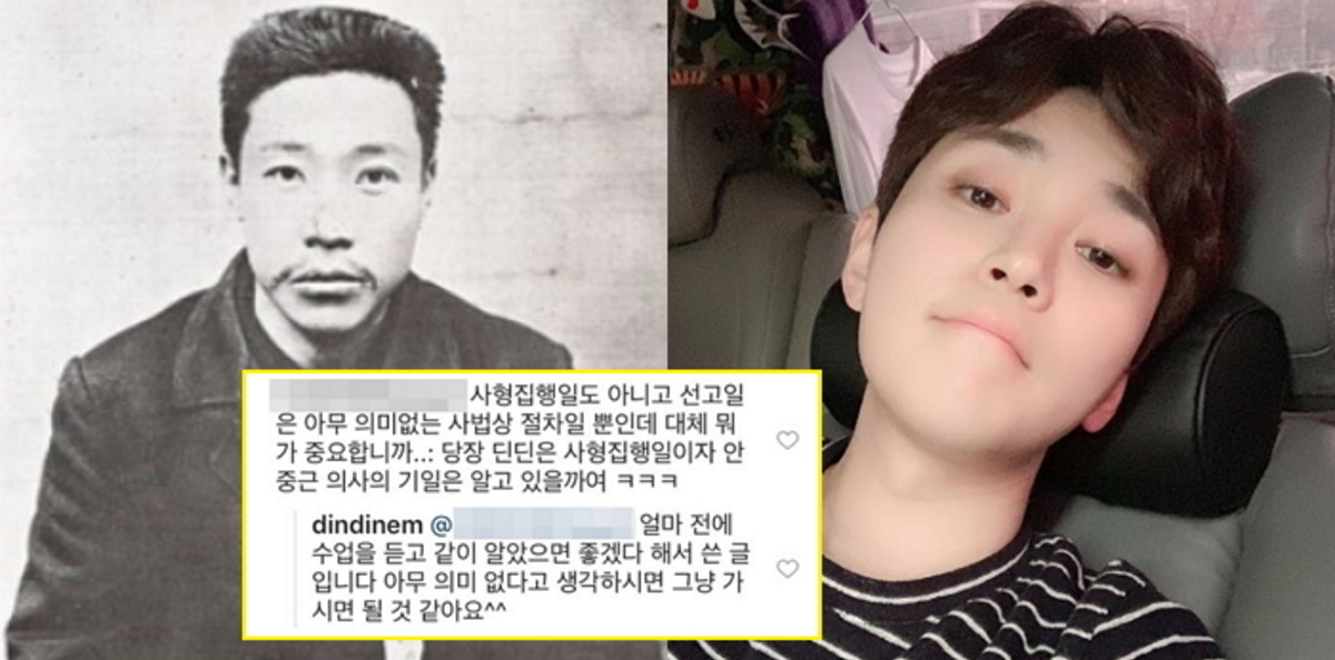그러자 한 누리꾼이 "사형집행일도 아니고 선고일은 아무 의미 없는 사법상 절차일 뿐인데 대체 뭐가 중요합니까. 당장 딘딘은 사형집행일이자 안중근 의사의 기일은 알고 있을까요"라는 댓글을 달았다.
