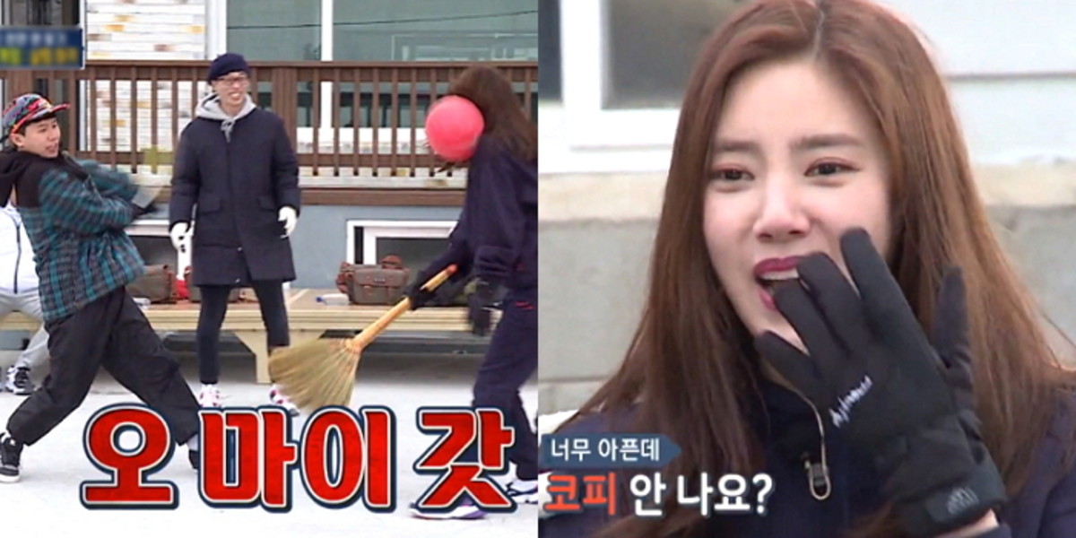 공에 맞은 손담비는 아프다며 눈물을 글썽이더니 코피가 안 나는지 확인하기 위해 얼굴을 어루만졌다.