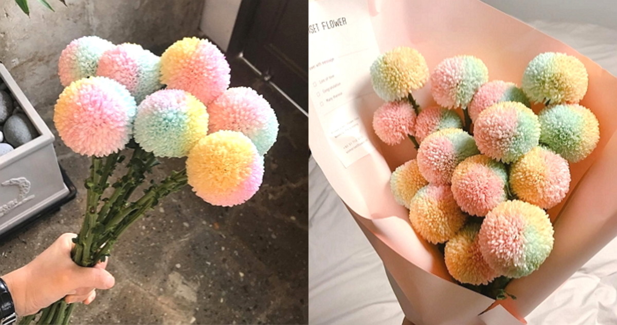 여러가지 추측을 불러일으키는 사진 속 물체의 정체는 무얼까. 예쁜 비주얼을 자랑하는 이것은 바로 '무지개 퐁퐁 꽃다발'이다.