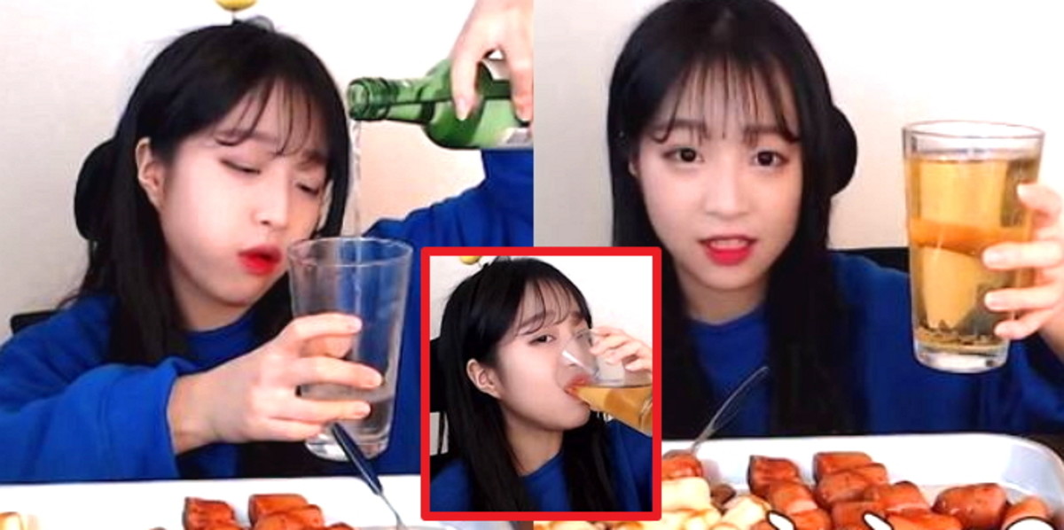 쯔양은 소주를 신나게 흔든 다음 자신의 얼굴만 한 유리컵에 부은 뒤 맥주를 따라 소맥을 제조했다.