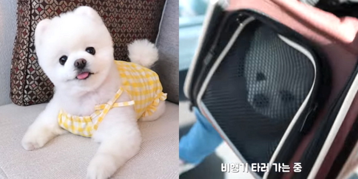 탑승 수속을 밟고 비행기에 탑승한 달리. 견주에 따르면 달리가 이동장 무게를 포함해 7kg 미만이기 때문에 기내 동반이 가능하며, 예약 시 사전 승인받으면 동반 탑승할 수 있다고 밝혔다.
