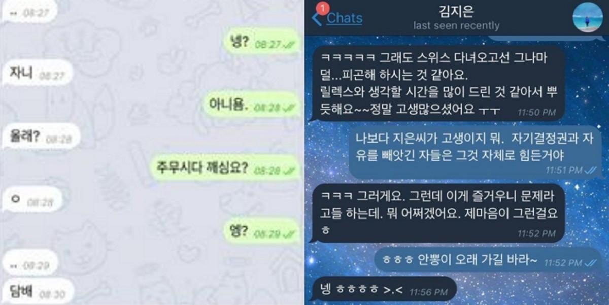 다음은 김지은씨가 도청에서 같이 일하던 지인들과 나눈 대화입니다. 카톡 대화를 그대로 옮겼습니다.