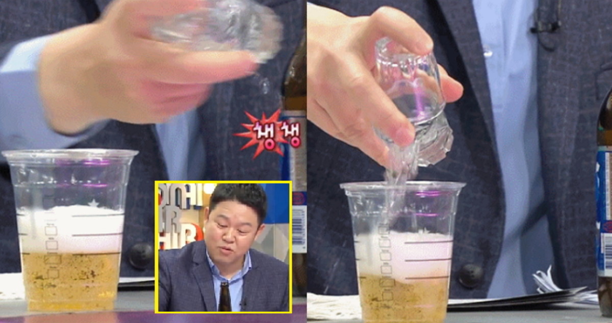그리고서 소주를 가득 따른 소주잔과 빈 잔을 겹친 뒤 맥주병에 툭툭 쳤다. 이후 계란을 까듯이 소주를 맥주에 넣으며 계란주를 완성했다.