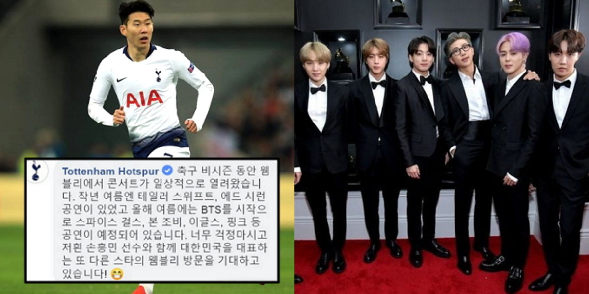 지난 20일(한국 시간) 토트넘은 공식 페이스북에 손흥민의 사진과 함께 "웰컴 투 웸블리, BTS"라는 글을 게재했다.