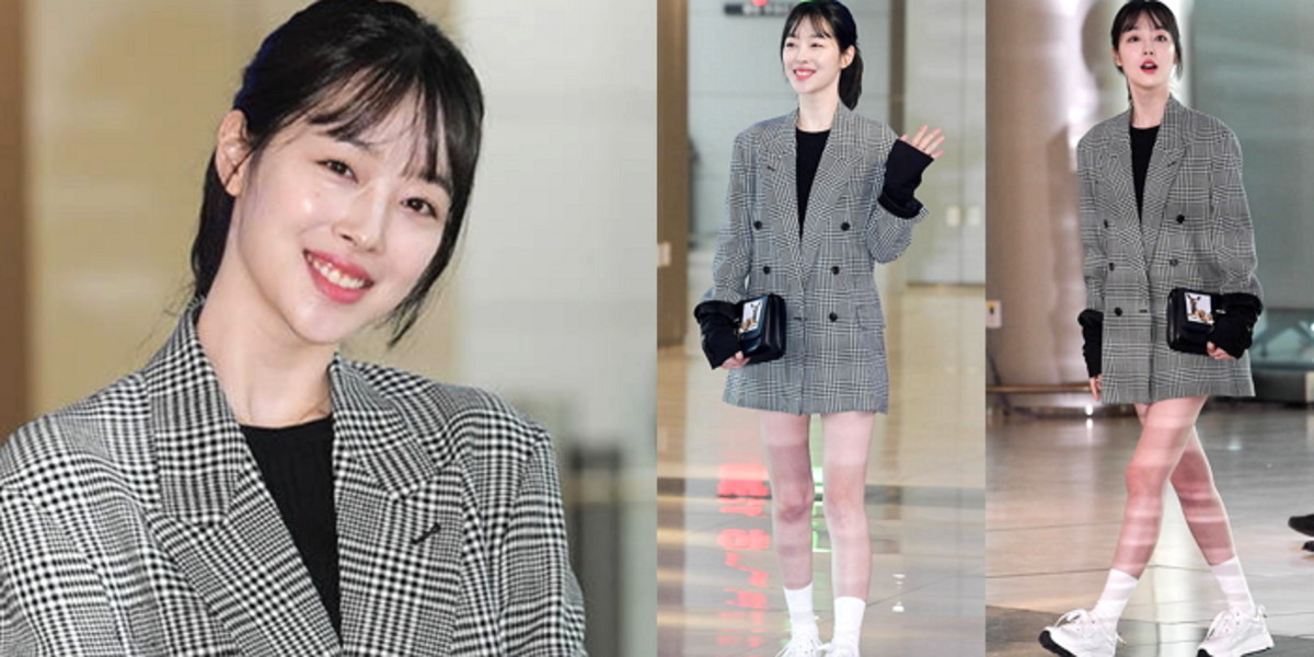 이날 설리는 따뜻해진 날씨에 걸맞게 체크무늬 재킷에 짧은 하의를 입고 등장했다.