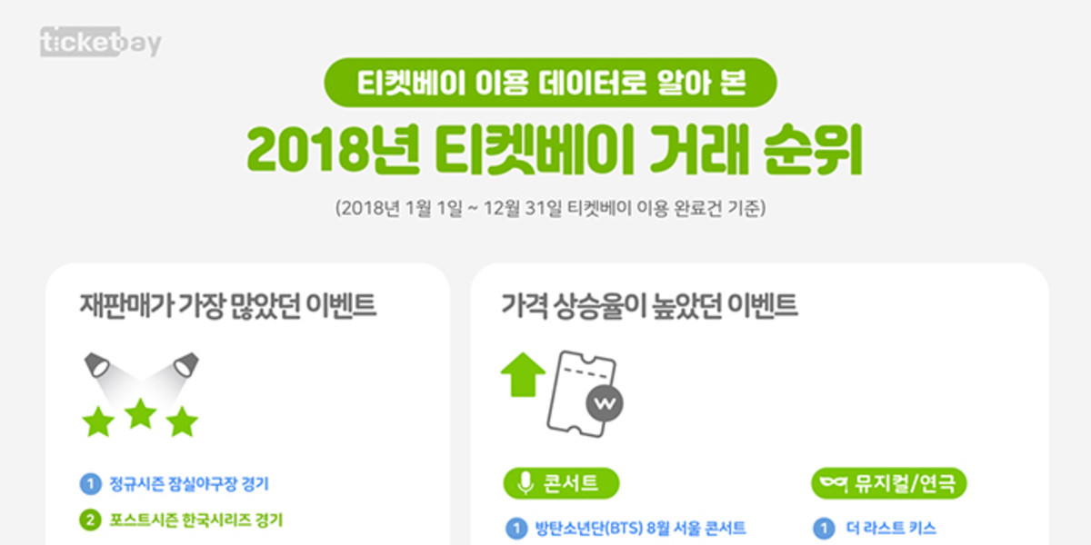 25일 티켓베이는 2018년 거래된 빅데이터를 기준으로 국내 티켓 재판매 시장 트렌드를 공개했다고 밝혔다.