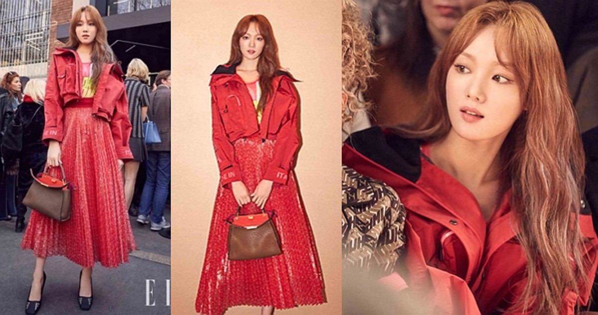 이날 이성경은 칼 라거펠트가 마지막으로 디자인한 펜디 로마 아모르 캡슐 컬렉션 중 레드 컬러의 플리츠 스커트와 로마 아모르 로고의 티셔츠에 숏자켓을 걸쳐 매혹적인 레드룩을 완성시켰다.
