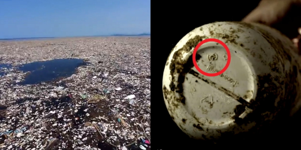 영상 속, 보트를 타고 조사하던 일행이 플라스틱 통을 뜰채로 건져냈다. 플라스틱 식품 용기에는 영어가 아닌 글자, 한글이 또렷하게 적혀있었다.
