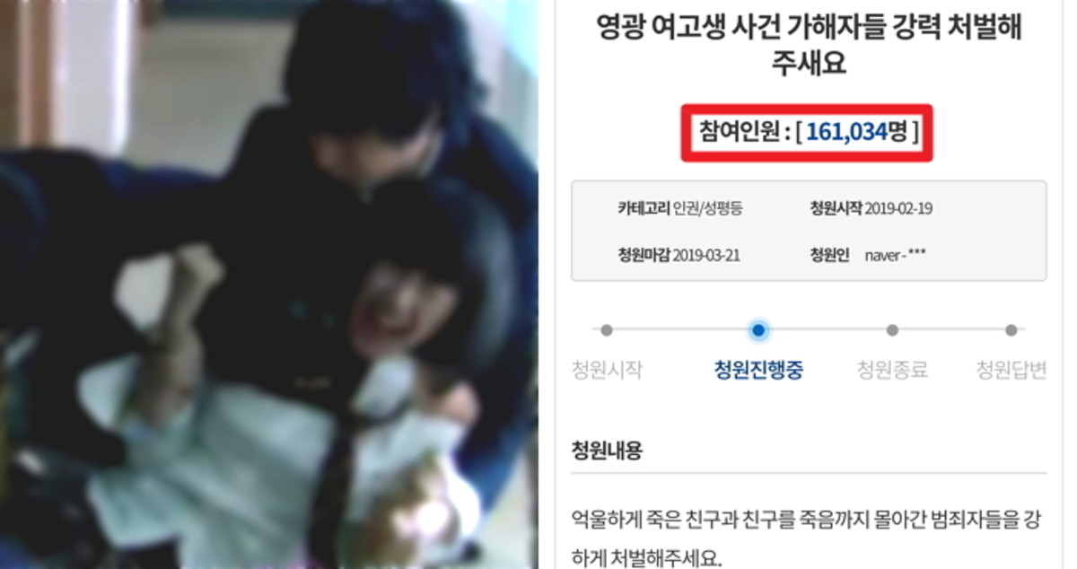'영광 여고생 성폭행 사망 사건'의 가해 학생들을 엄벌에 처해달라는 청와대 국민청원이 게재 일주일 만에 16만 명의 동의를 얻었다. 20만 명이 넘을 경우 청와대는 해당 사건에 관해 답변하게 된다.