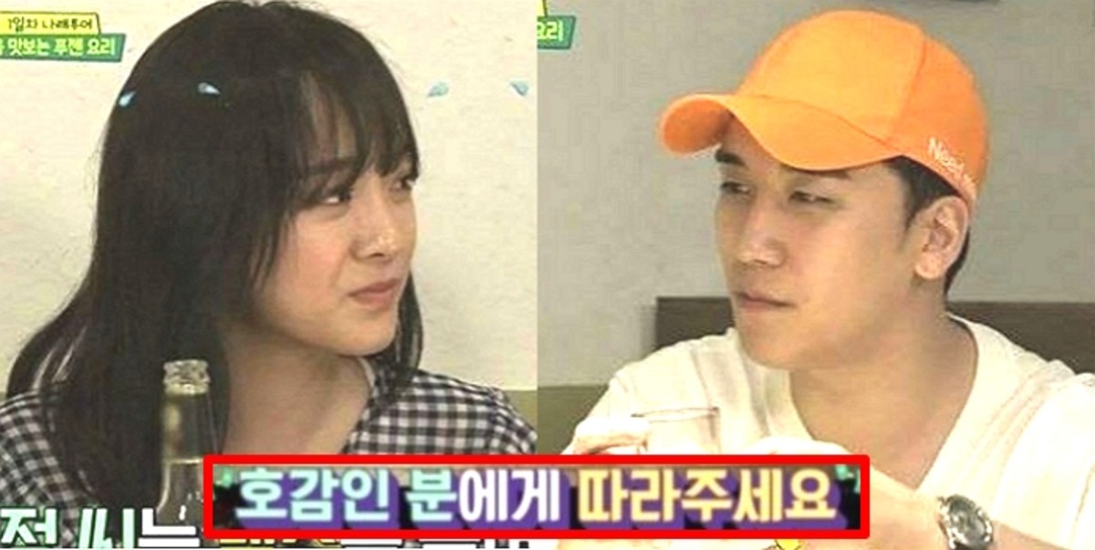 당시 승리는 "세정 씨가 '짠내투어' 오셨으니까, 지금 남자가 5명 있습니다. 그 사람의 위치, 인지도 그런 건 다 집어치우고 그 사람의 성향과 스타일만 봤을 때 (마음에 드는 사람에게 따르세요)"라면서 세정에게 술을 따를 것을 권유했다.