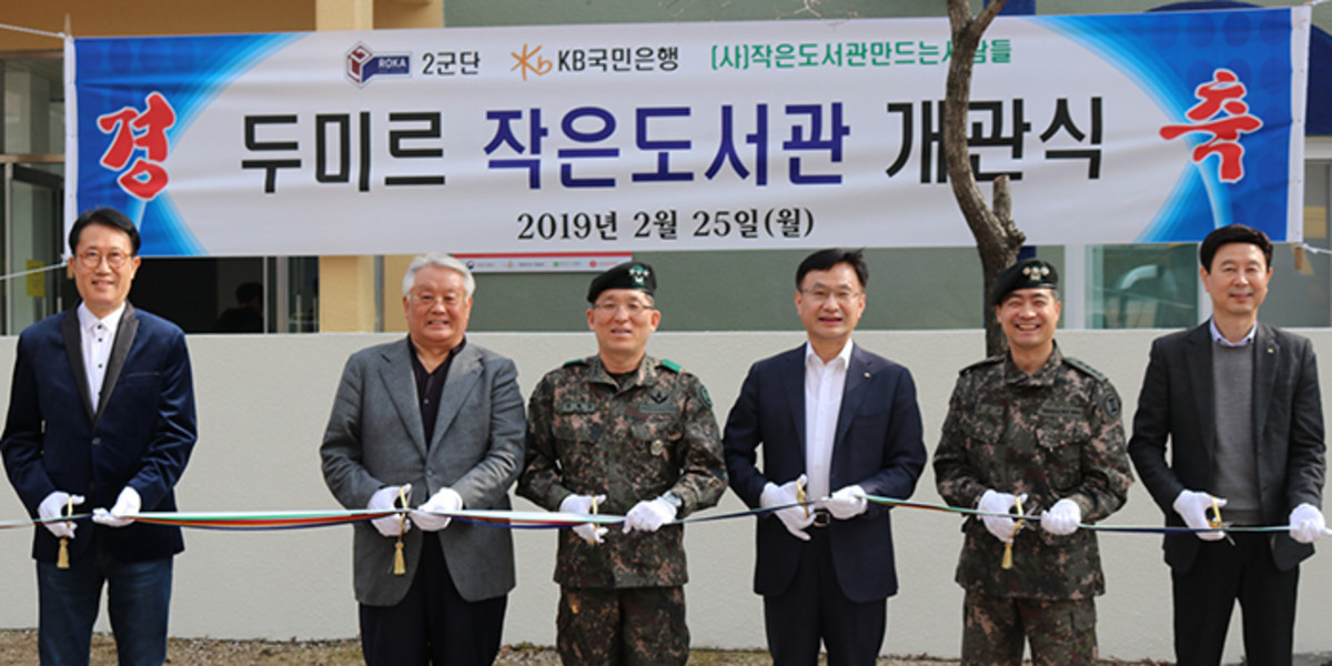이번 '두미르 작은도서관'은 KB국민은행이 지원한 76번째 작은도서관으로, 육군2군단 관사인 두미르 아파트 보육지원센터 2층에 있는 공간을 새롭게 리모델링했다.
