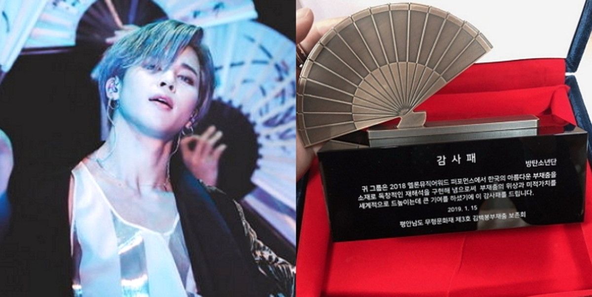[인사이트] 지미영 기자 = 방탄소년단 지민이 화려한 부채춤으로 전통 문화재 위상을 높이는 데 기여해 감사패를 받았다.