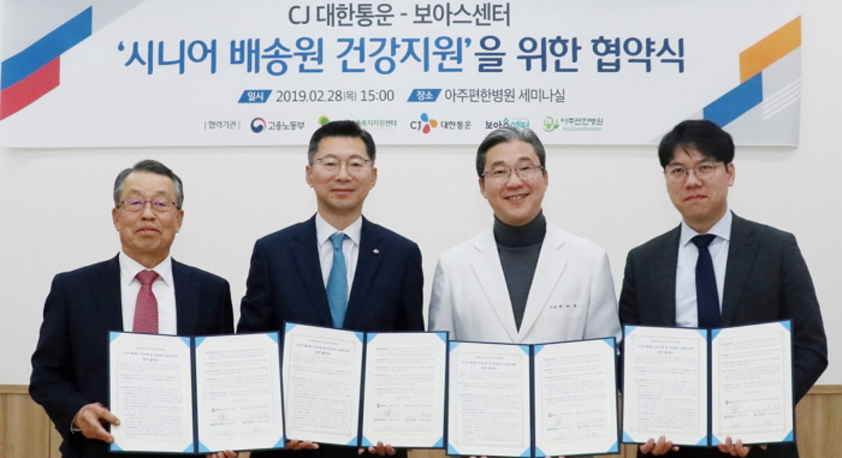 28일 CJ대한통운은 28일 경기도 수원시 장안구에 위치한 아주편한병원에서 고용노동부, 나눔고용지원복지센터, 보아스센터, 아주편한병원과 함께 'CJ대한통운-보아스센터 실버택배 배송원 의료공헌사업을 위한 업무협약'을 체결했다고 밝혔다.