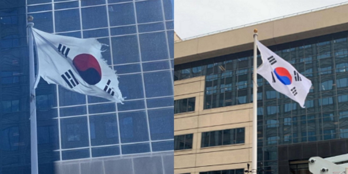 [인사이트] 황기현 기자 = 재미교포와 국내 지자체가 미국 뉴저지주 한 도시 공공건물에 훼손된 채 걸려 있던 태극기를 새것으로 교체했다.