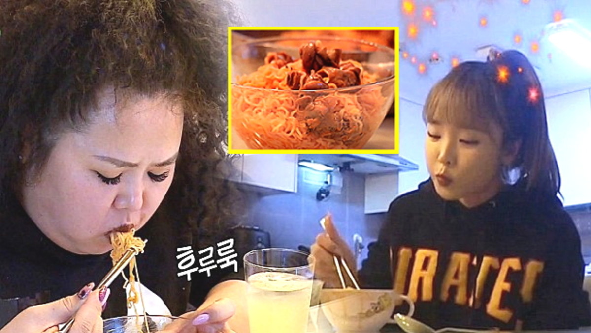 그렇게 골뱅이를 첨가한 윤기 좔좔 흐르는 비빔라면을 완성시킨 둘은 식탁에 앉아 침샘 자극하는 먹방을 시작했다.