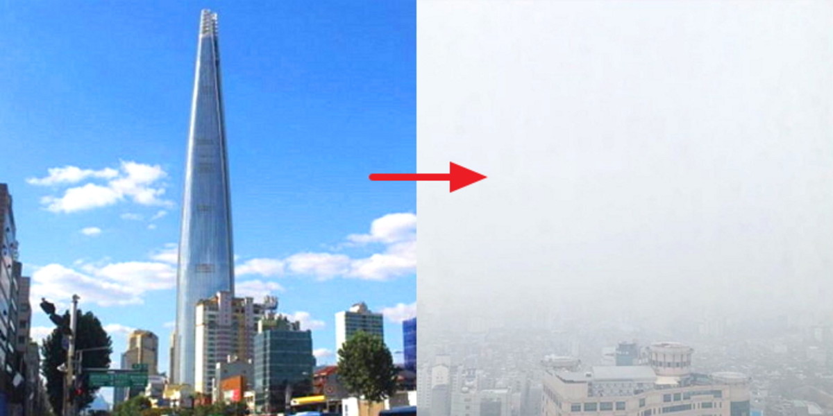 해당 사진에는 지상 123층, 높이 555m에 달하는 롯데월드타워가 미세먼지에 가려 완전히 자취를 감춘 모습이 담겼다.