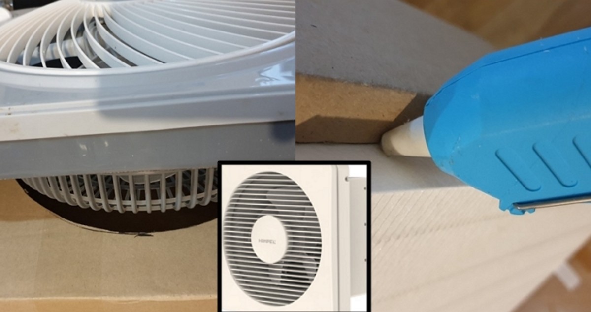 상자 박스를 팬의 크기에 맞춰 자른 뒤, 팬을 끼워 넣었다. 그리고 그 뒤에 헤파필터를 놓고 공기가 통하지 않도록 글루건을 통해 꼼꼼히 마감 작업을 해줬다.