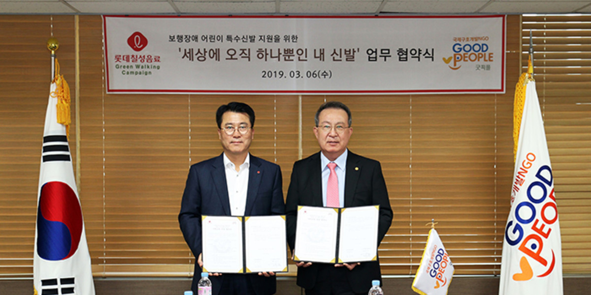 7일 롯데칠성음료는 지난 6일 NGO '굿피플인터내셔널'과 보행장애 아동을 위한 '세상에 오직 하나뿐인 내 신발 캠페인' 협약식을 진행했다고 밝혔다.