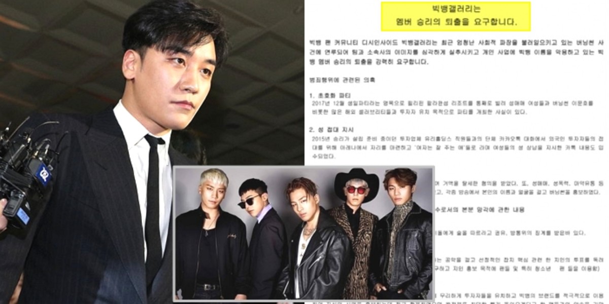 9일 온라인 커뮤니티 디시인사이드 빅뱅 갤러리에는 "YG엔터테인먼트 승리의 퇴출을 촉구한다"라는 제목의 성명서가 게재됐다.