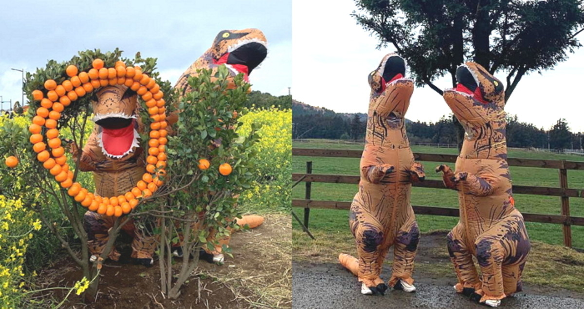 온라인 쇼핑몰에서 사나운 티라노사우루스 모습의 공룡 슈트를 사고, 봄기운이 찾아오기 시작한 제주도를 찾은 것이다.