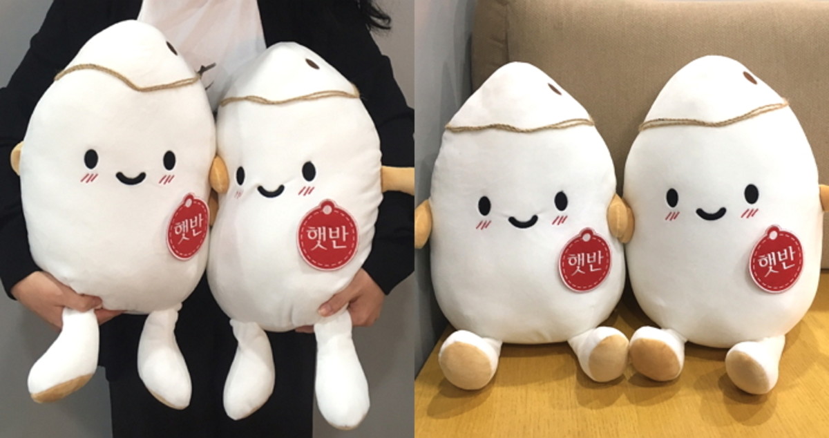 2개만 안아도 품에 가득 차는 크기의 '햇반인형'은 하얀 쌀알을 모티브로 탄생한 캐릭터로 제작됐다. 위가 뾰족한 둥근 타원형의 하얀색이다.