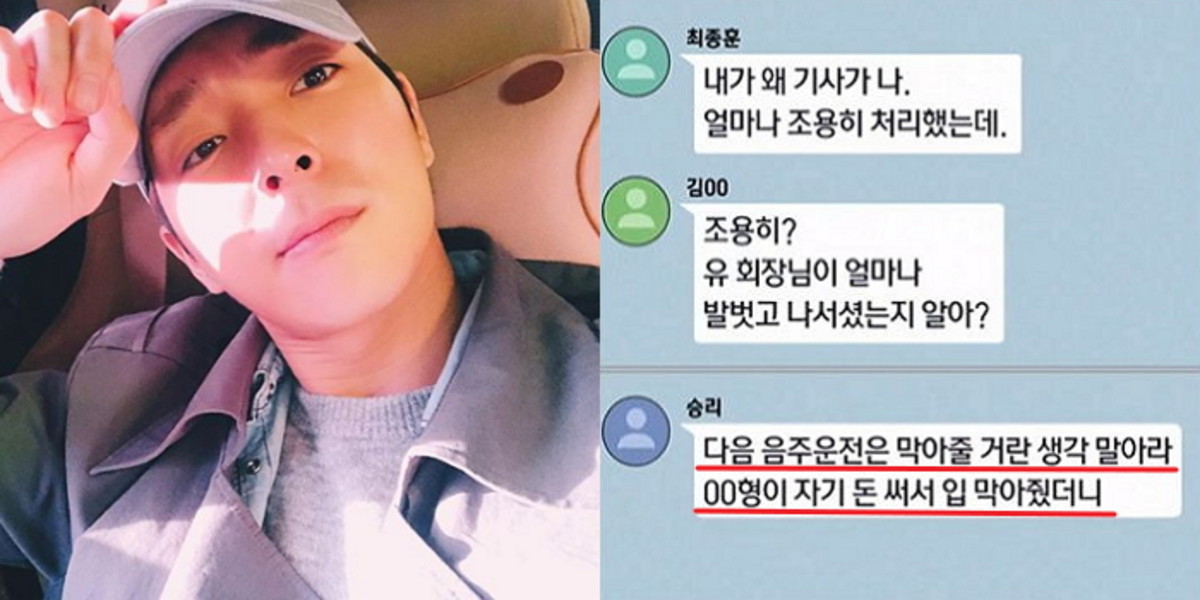 [인사이트] 디지털뉴스팀 = FT아일랜드 멤버 최종훈이 과거 카카오톡 단체 채팅방에서 했던 음주 운전 관련 대화 내용이 공개됐다.