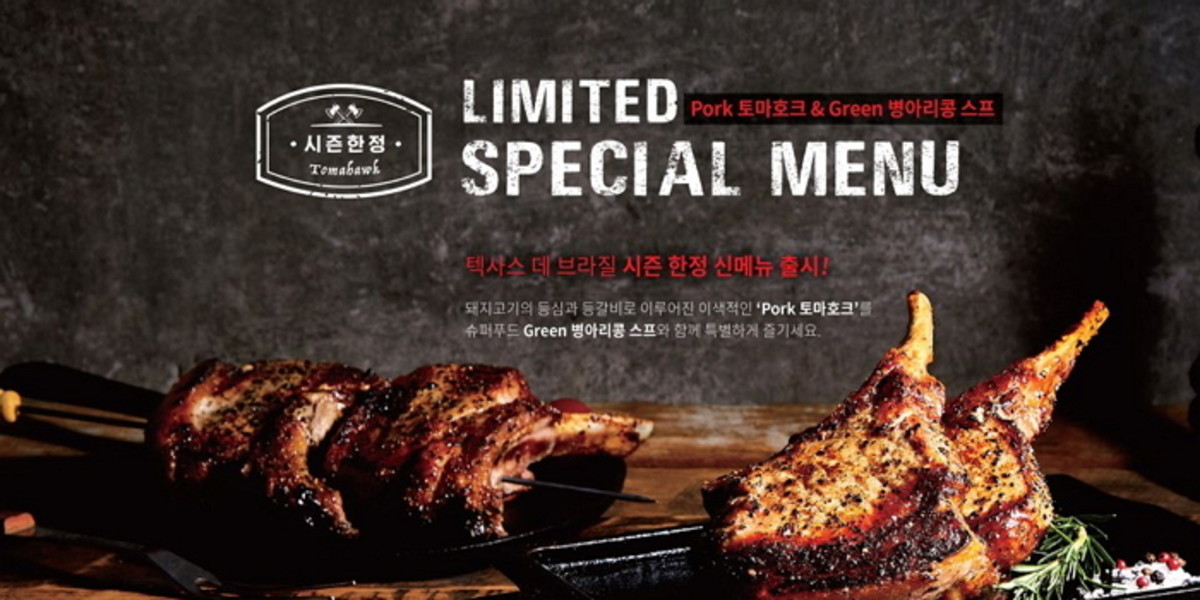 텍사스 데 브라질에서 새롭게 선보이는 시즌 한정 메뉴 'Pork 토마호크'는 국내산 100% 돼지고기의 등심과 등갈비 부위로 이루어져 있다.