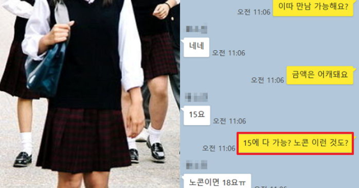 여중생이 "네네"라고 대답하자 그는 금액을 묻고 대화를 이어나갔다. 이어 "15에 다가능? 노콘 이런것도?"라고 덧붙였다.