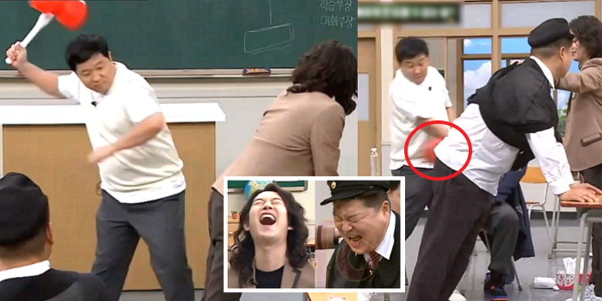 '뿅망치 때리기'의 달인으로 유명한 그는 강력한 풀 스윙으로 김희철의 엉덩이를 가격했다.