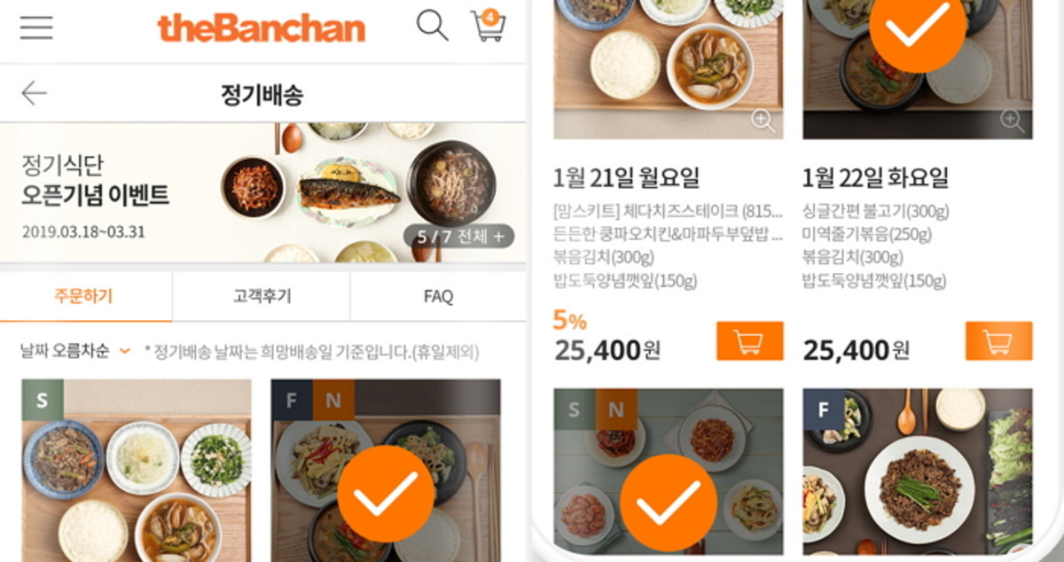 정기배송 서비스는 매일 각기 다르게 구성된 식단 목록을 보고 원하는 날짜의 상품을 일괄 선택해 주문하는 서비스다.